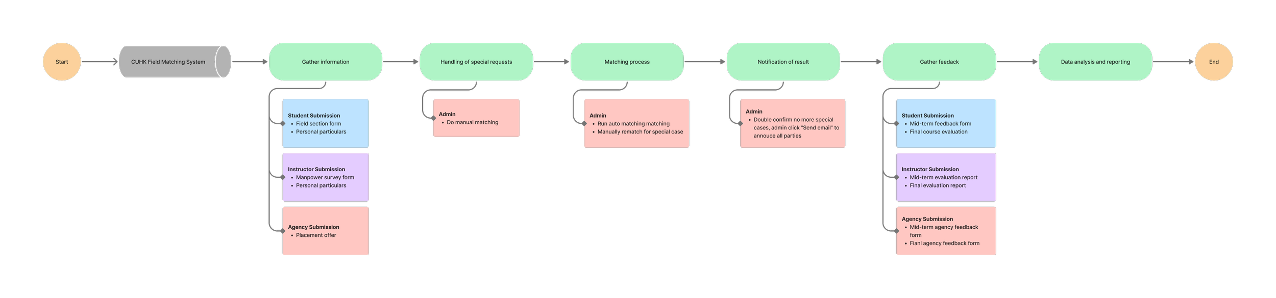 The Fieldwork Matching System aims to automate and streamline the placement process for CUHK social work students, efficiently matching students, instructors, and agencies. It will enhance record-keeping, improve efficiency, and incorporate automatic notifications to keep all parties informed throughout the placement process, ensuring a seamless experience.