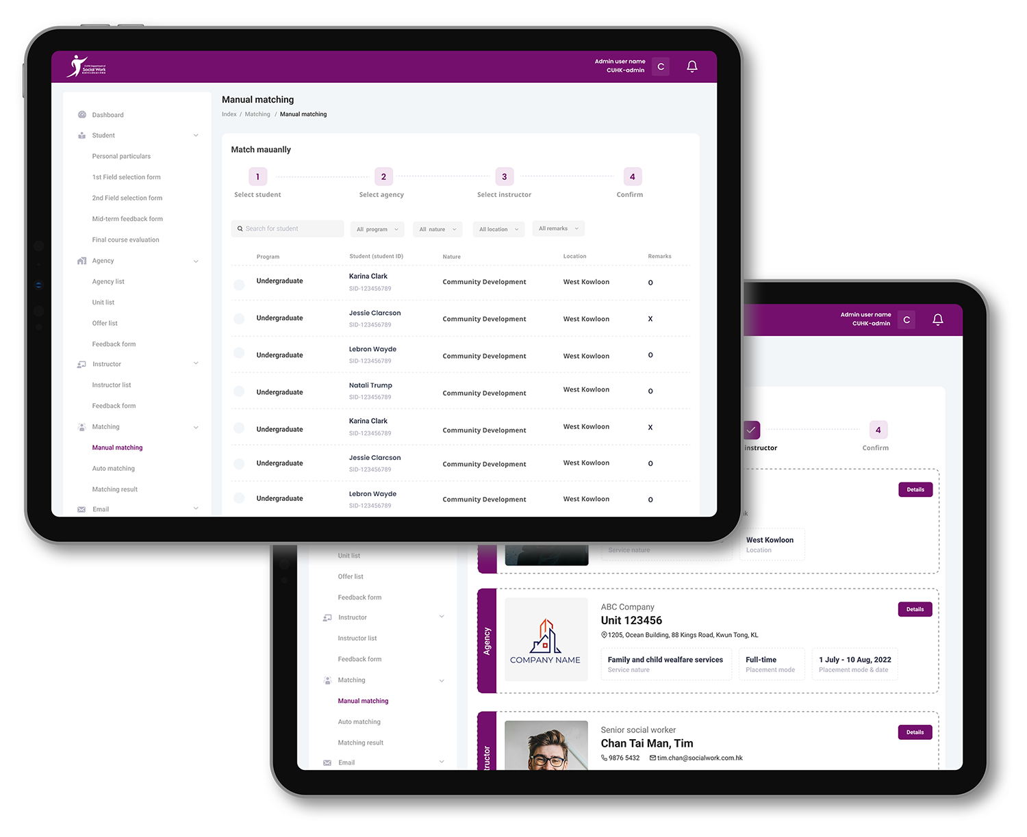The CUHK social work program traditionally relied on manual processes for fieldwork placements, using email and paper submissions. This method resulted in time-consuming manual matching of students, instructors, and agencies, creating inefficiencies and challenges in record-keeping. A more streamlined solution is needed to enhance the placement process.