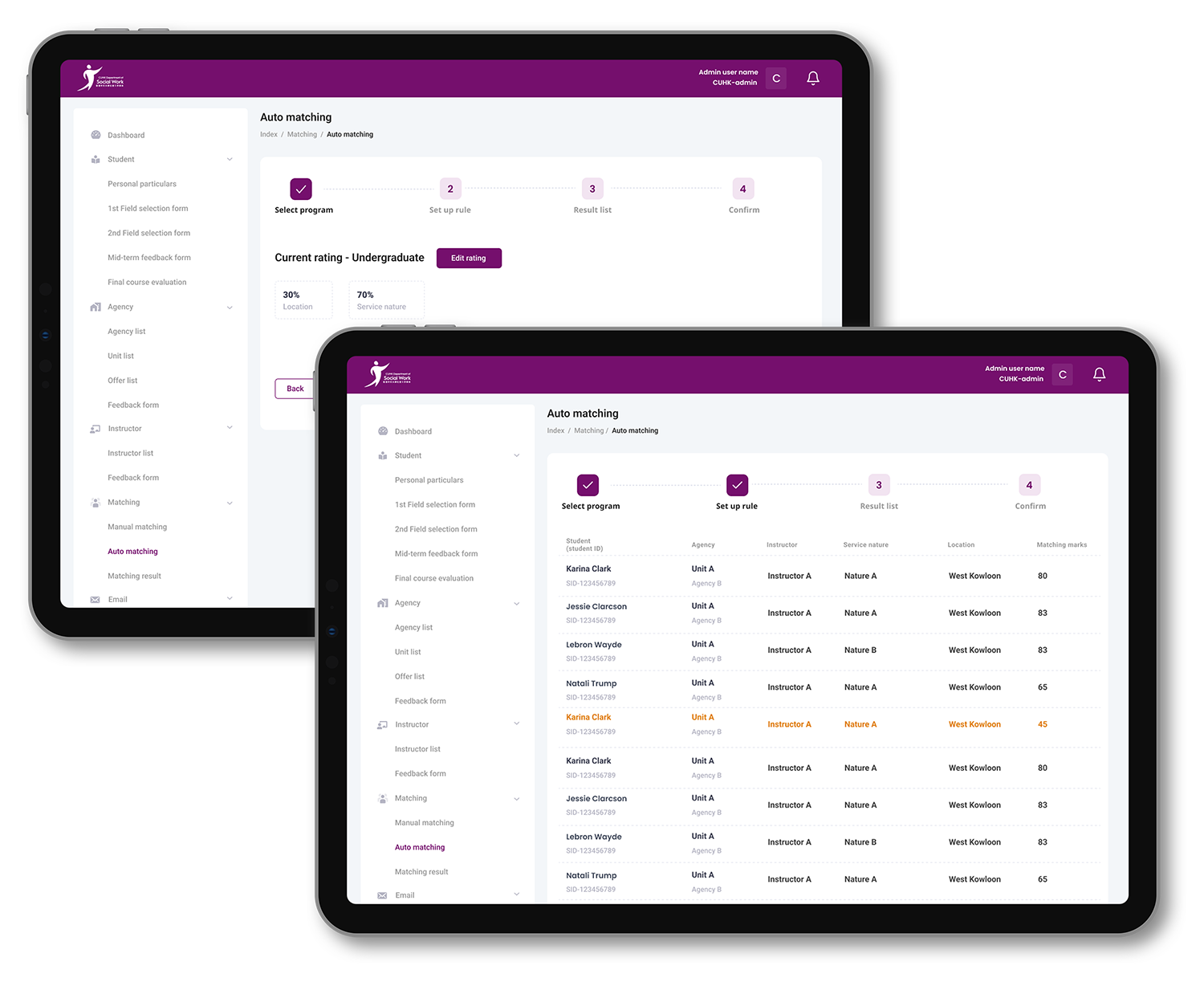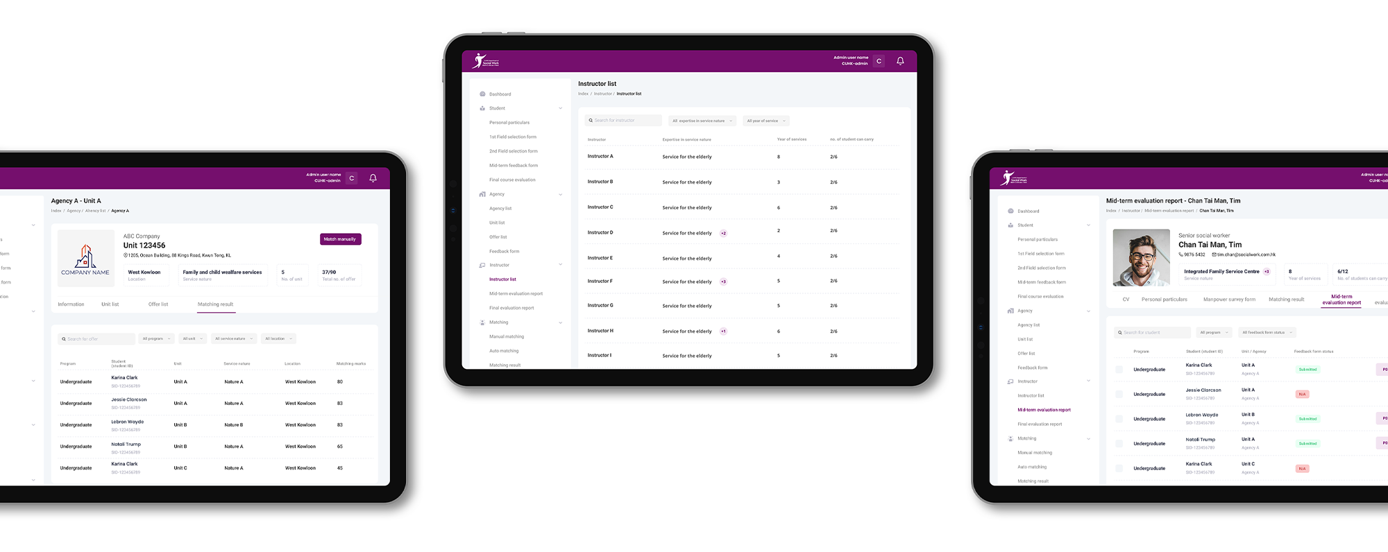 Separate interfaces for students, instructors, agencies, and CUHK administration to enhance usability and personalization.