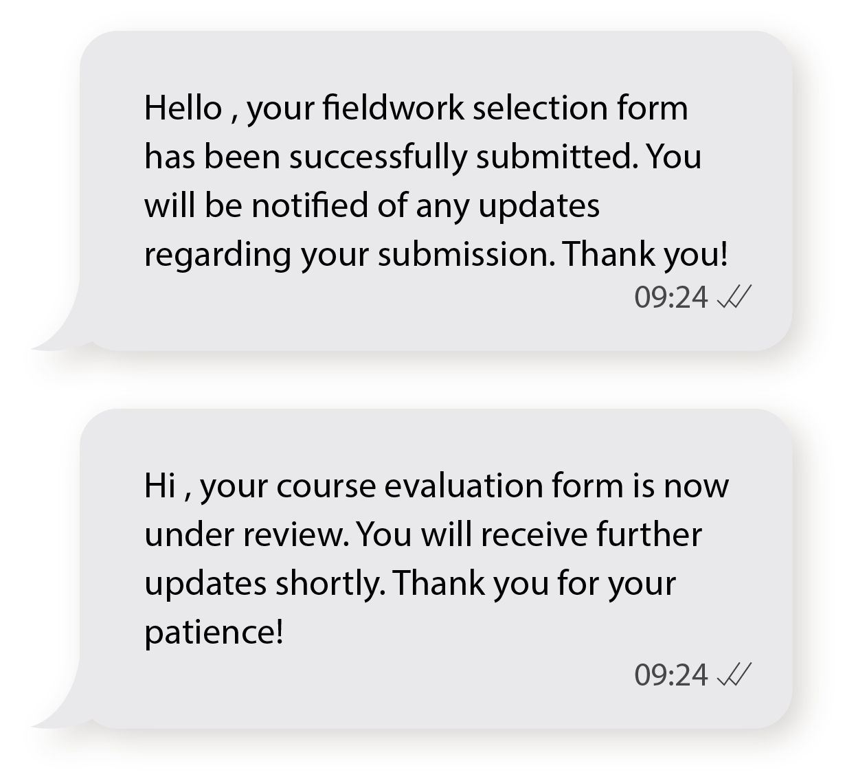 Students will receive automatic SMS notifications about any status changes regarding their submission progress and matching results. This ensures they remain informed throughout the process, promoting transparency and keeping them updated on important developments related to their submissions.