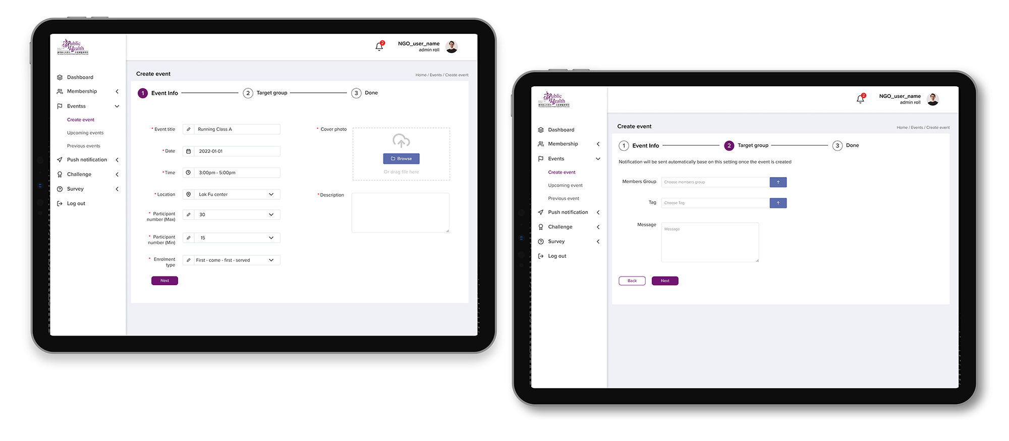 A new event can be easily created in the CMS by entering basic information such as date, time, and number of participants. Once the target group is set up, notifications will be sent to those users to invite them to enroll.