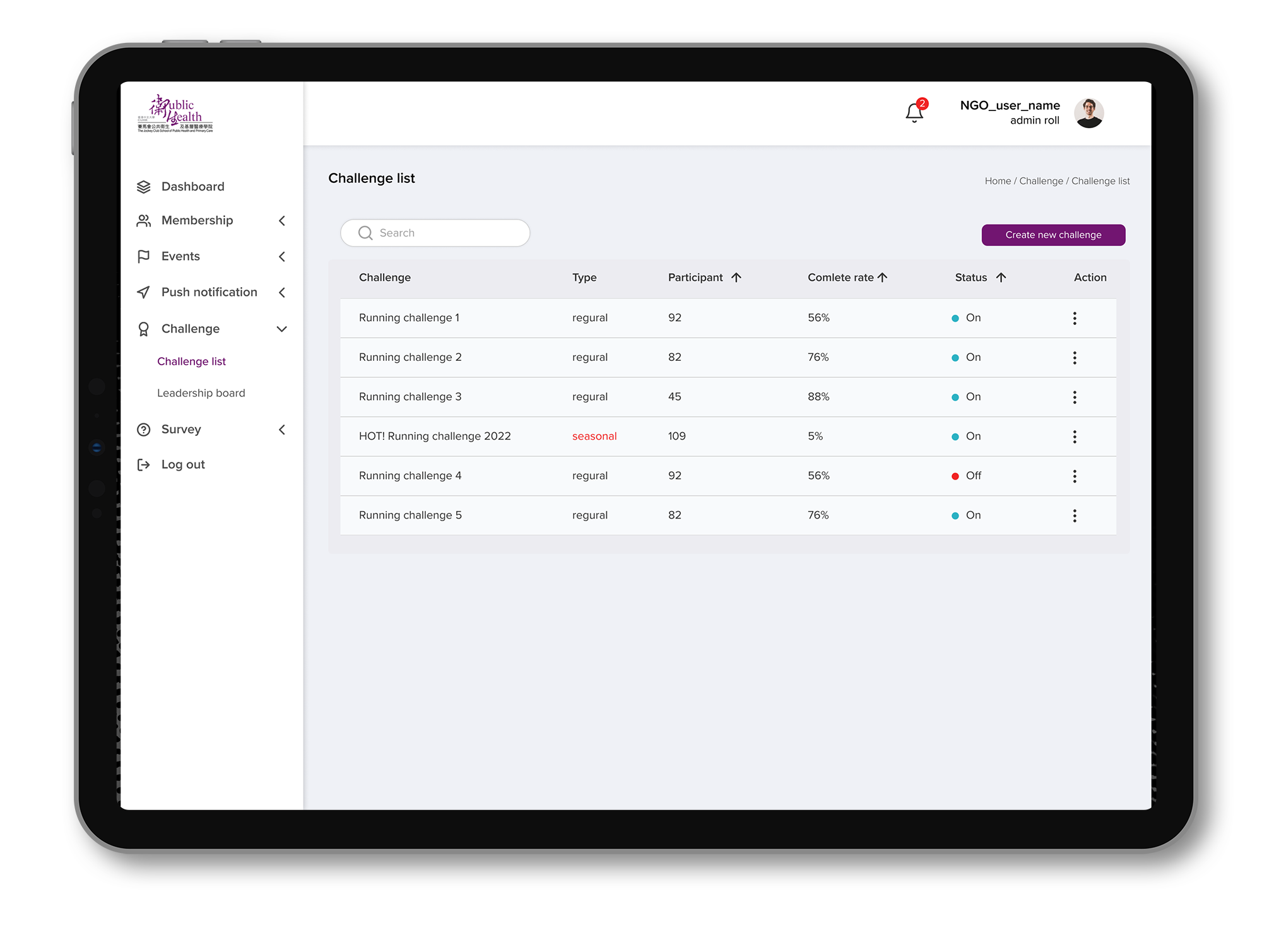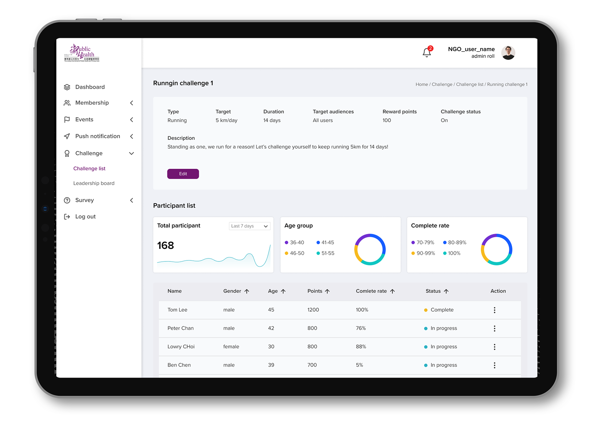 Easily create and organize challenges via the CMS, monitoring participant information and performance with displayed key metrics. Charts provide insights for admins to analyze challenge performance effectively.