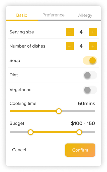 Users can easily update their cooking preferences to accommodate different situations, including serving size, food preferences, and allergy status, ensuring personalized meal options that fit their current needs.