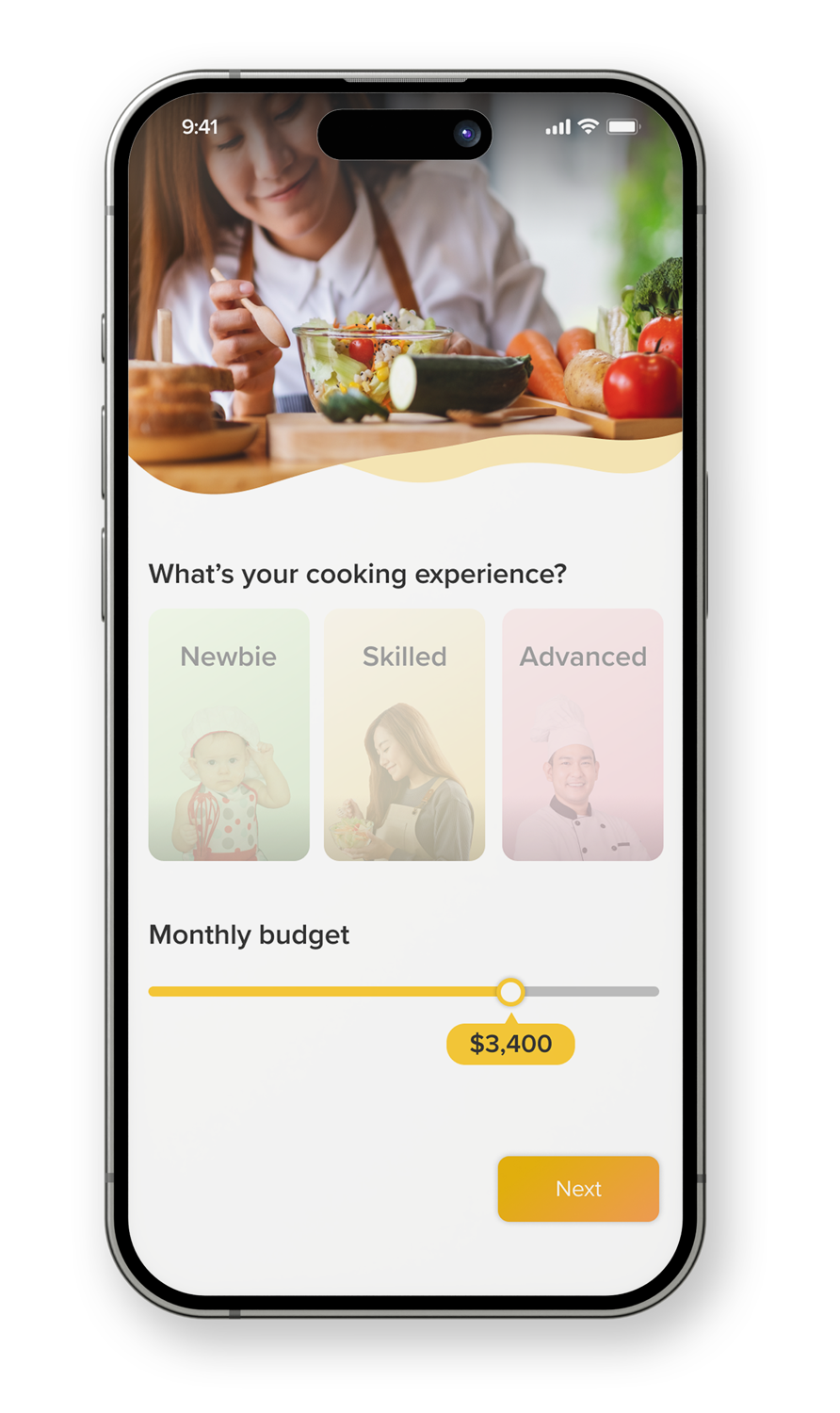An intuitive onboarding screen guides users through a seamless setup, highlighting features that simplify meal planning and grocery shopping, empowering them to enjoy the cooking process with greater ease.